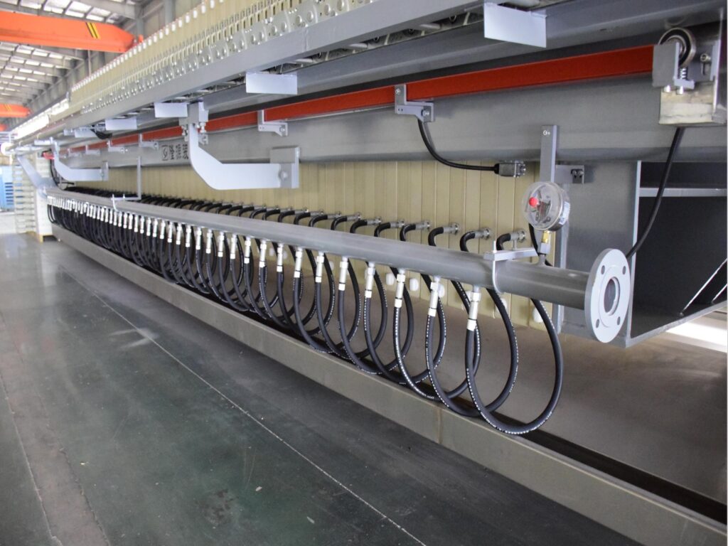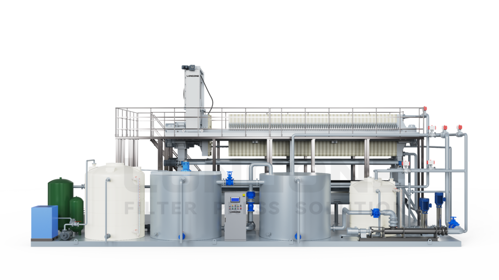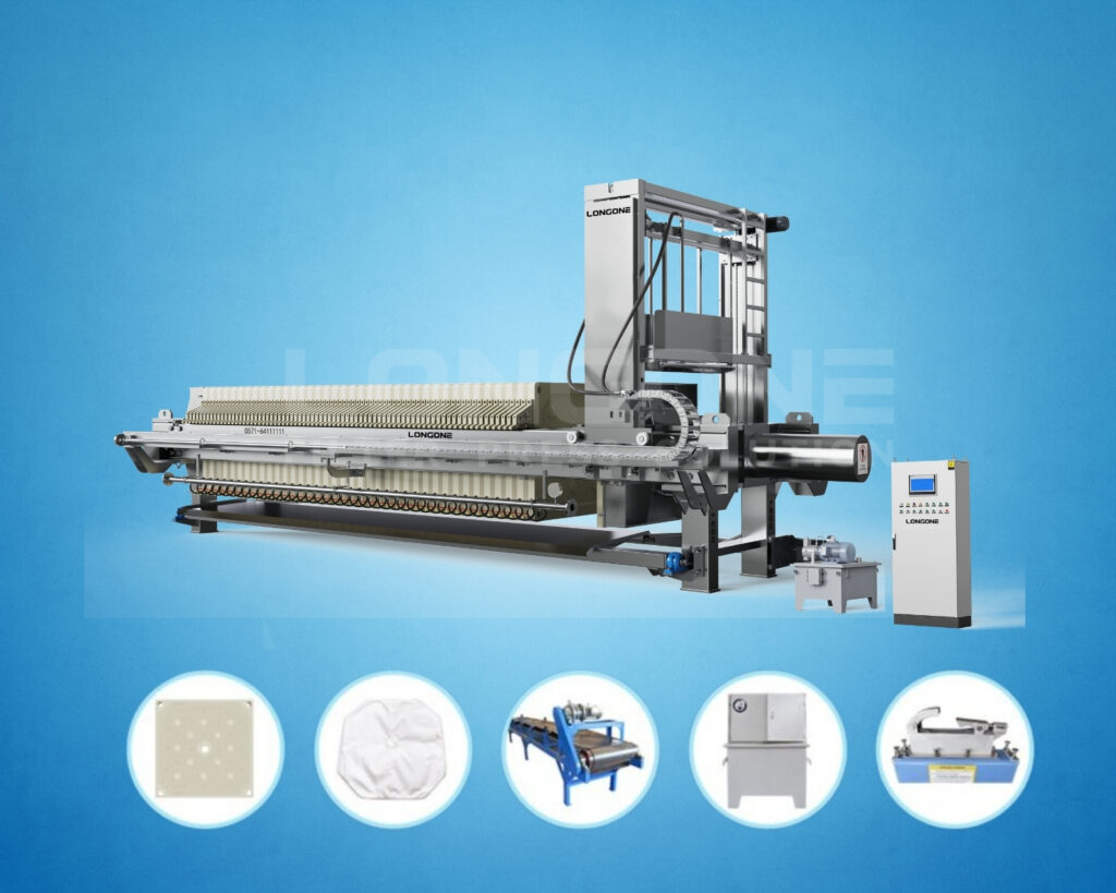 Systems for filter presses. The system minimizes human involvement, lowers operating costs, and guarantees consistent filtration quality by combining smart controls with automated mechanical functions. Automatic features speed up the cycle time, make things safer, and keep the output steady in tough industrial settings, making the equipment perfect for big, ongoing production lines.