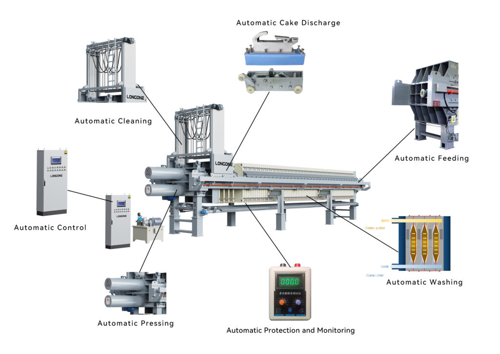 - Fully Automated Operation – Automatic plate shifting, cake discharge, cloth washing, and pressure control.