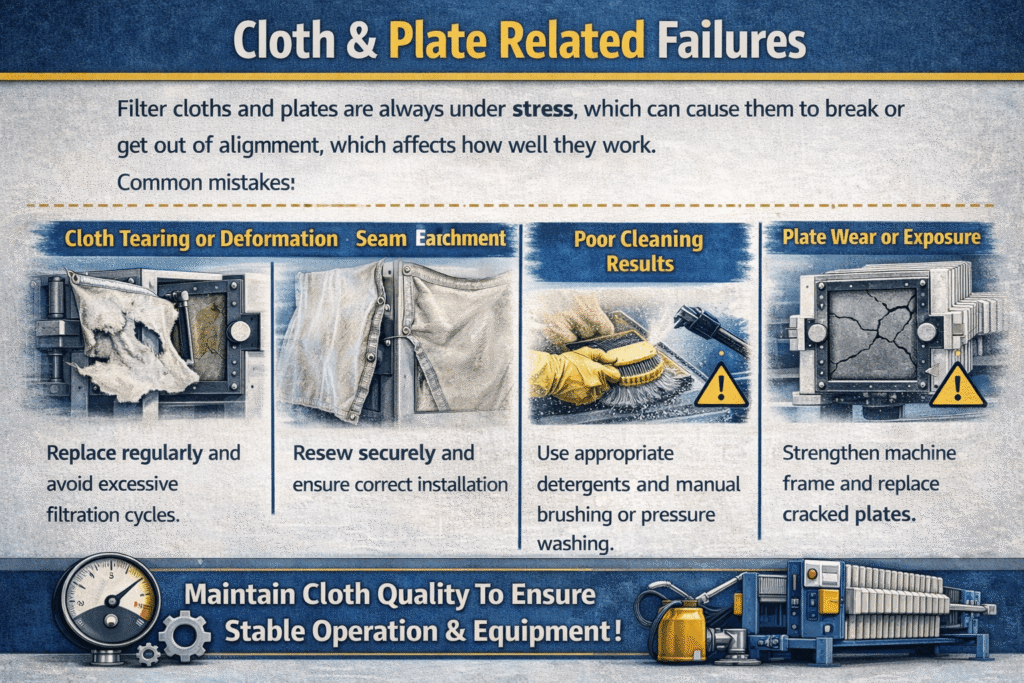 | Filter cloth seam detachment | Weak stitching, poor connection to frame | Reseam cloth, improve connection |