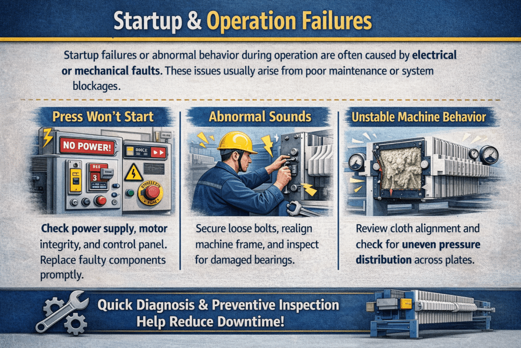 Here is a quick overview of frequent filter press faults, causes, and solutions: